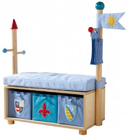 Asiento ropero Castillo de los caballeros. Con 3 cajones de tela. Asiento acolchado y bolso desmontables. Material: Tablero de madera estratificada con chapa de madera de abedul y reborde de abedul, asiento de gomaespuma con funa de algodón/poliéster.
